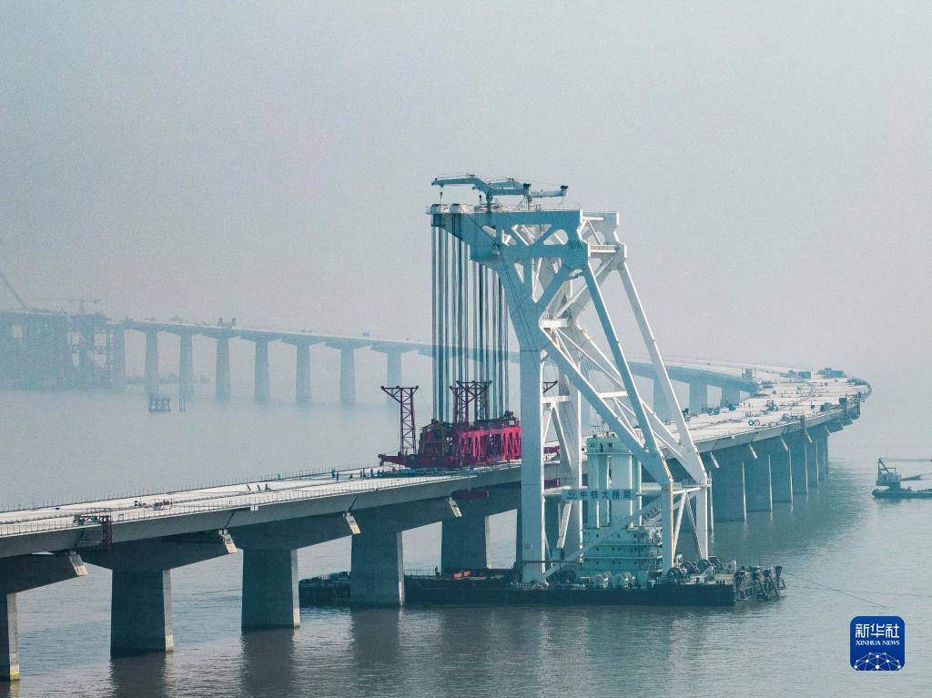 11月10日,深中通道海上非通航孔桥即将架设最后一片混凝土箱梁(无人机照片)。 当日,深中通道海上非通航孔桥混凝土箱梁全部架设完成。深中通道是集“桥、岛、隧、水下互通”于一体的跨海集群工程,全长约24公里,其中桥梁工程长约17公里。 新华社发(陈正东摄)