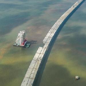 深中通道海上非通航孔桥完成全部混凝土箱梁架设---11月10日,起重船将深中通道海上非通航孔桥最后一片混凝土箱梁架设至指定桥墩(无人机照片)。