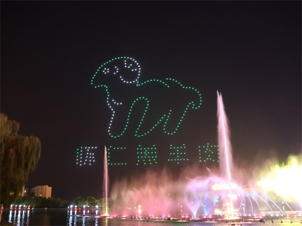 伴随舞动的喷泉,深蓝色的夜空中一个个色彩斑斓的光点在夜空汇聚,刹时“怀仁羔羊肉交易大会”字样在空中赫然呈现,300架无人机在统一调度下井然有序地变换着阵形,花式“表白”怀仁羔羊肉交易大会。可爱的羔羊,逼真的火锅、羊肉串等代表怀仁风土人情和地域特色的图案和动画轮番上演,为广大市民呈现了一场“科技与文化之美”的视觉盛宴。