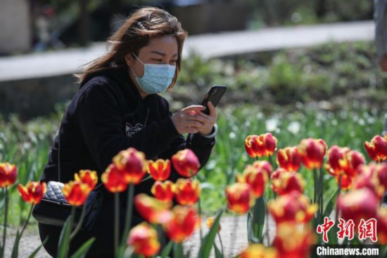 一位游客在拍摄盛开的郁金香。 瞿宏伦 摄