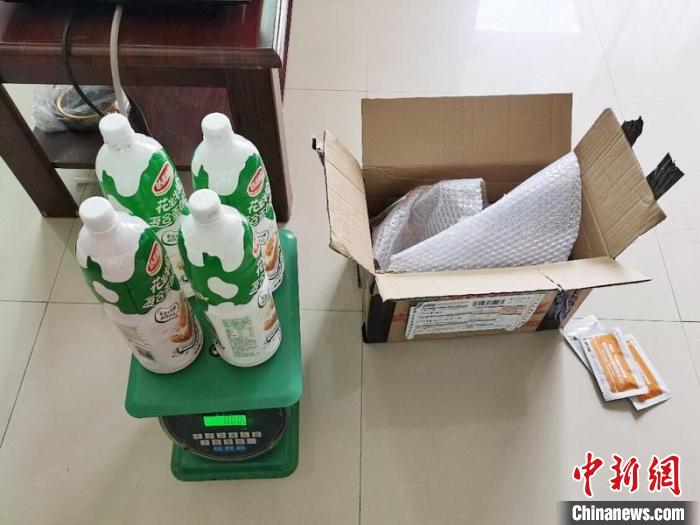 民警随即对包裹开箱检查,发现包裹里的装的是4瓶花生牛奶,瓶口均用透明胶带缠绕。经进一步检查,发现瓶内装的不是花生牛奶,而是“自烤酒”,且和平时的自烤酒气味不一样,有一股刺鼻性气味。民警当场用检测试纸进行检测,发现4瓶“花生牛奶”内的液体均含有冰毒成分,经称量,共计6.26公斤。